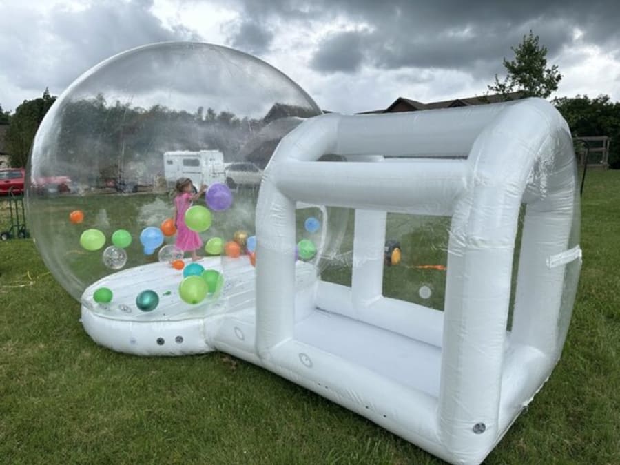 (Dry Only) 10ft x 16ft layout and a spacious 10ft x 10ft bubble dome with an integrated bouncy area. Add your own balloons or we can add some for you! Just let us know what colors you want and we can accommodate you! Very unique small bounce house! Perfect for your next small party, get together. Fits up to 5 children with a max total weight limit of 400lb.