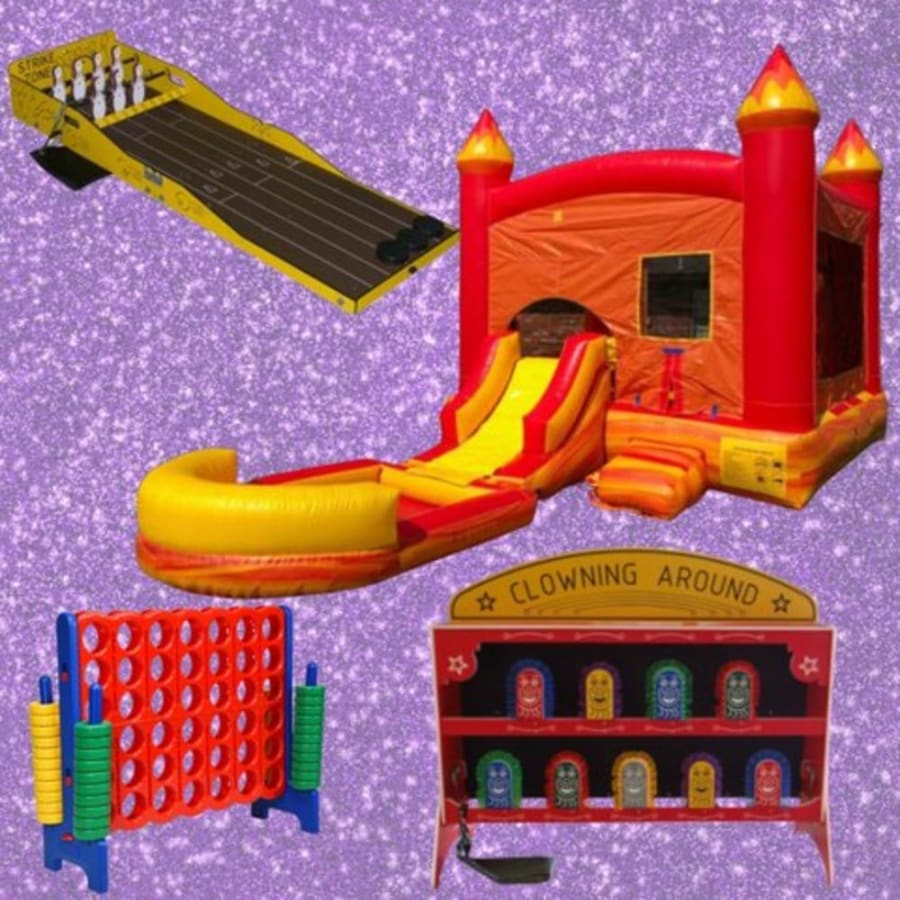 Save $100 with our Party Package!  In this package you receive a Lava Combo Bounce House, Table Top Bowling Game, Table Top Clown Carnival Game and Jump 4-To-Score Game.