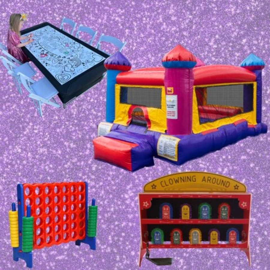 Save $100 with our Party Package! In this package you receive a (Dry Only) Mini Bounce House with a Ball Pit, Childrens Coloring Table, Table Top Clown Carnival Game and Jump 4-To-Score Game.