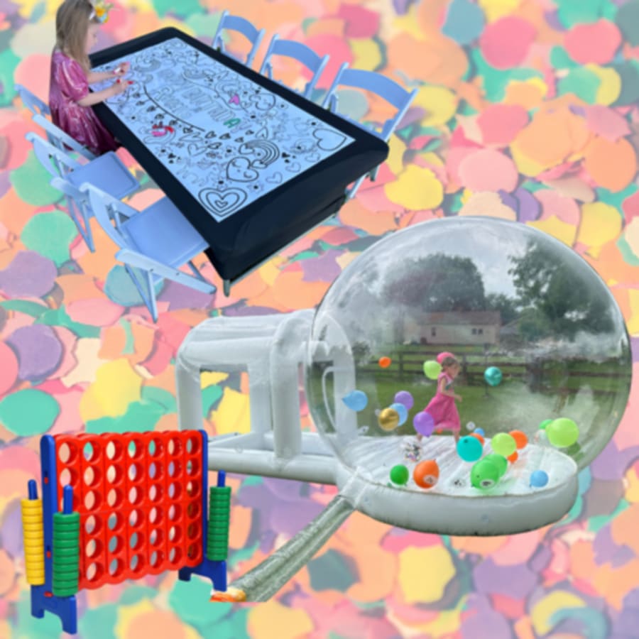 Save $100 with our Party Package! In this package you receive a Bubble Bounce House, Custom Child Coloring Table and Jump 4-To-Score Game.